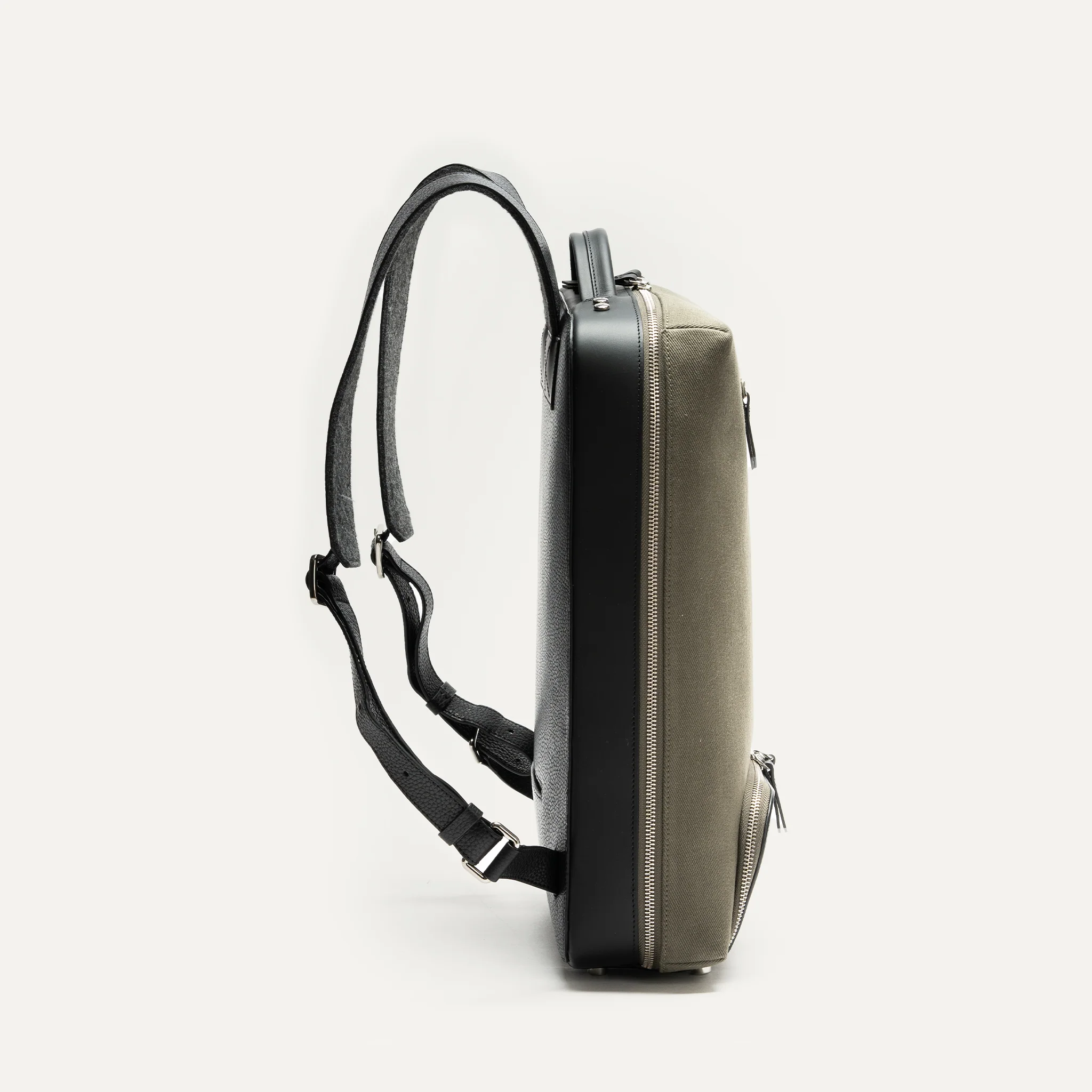 Le sac à dos Rubens associe toile de coton kaki déperlante et cuir grainé noir au tannage végétal pour un style à la fois élégant et résistant. Conçu pour les professionnels modernes, ce sac compact et léger offre un maximum de rangements pour organiser facilement tous vos accessoires de bureau.