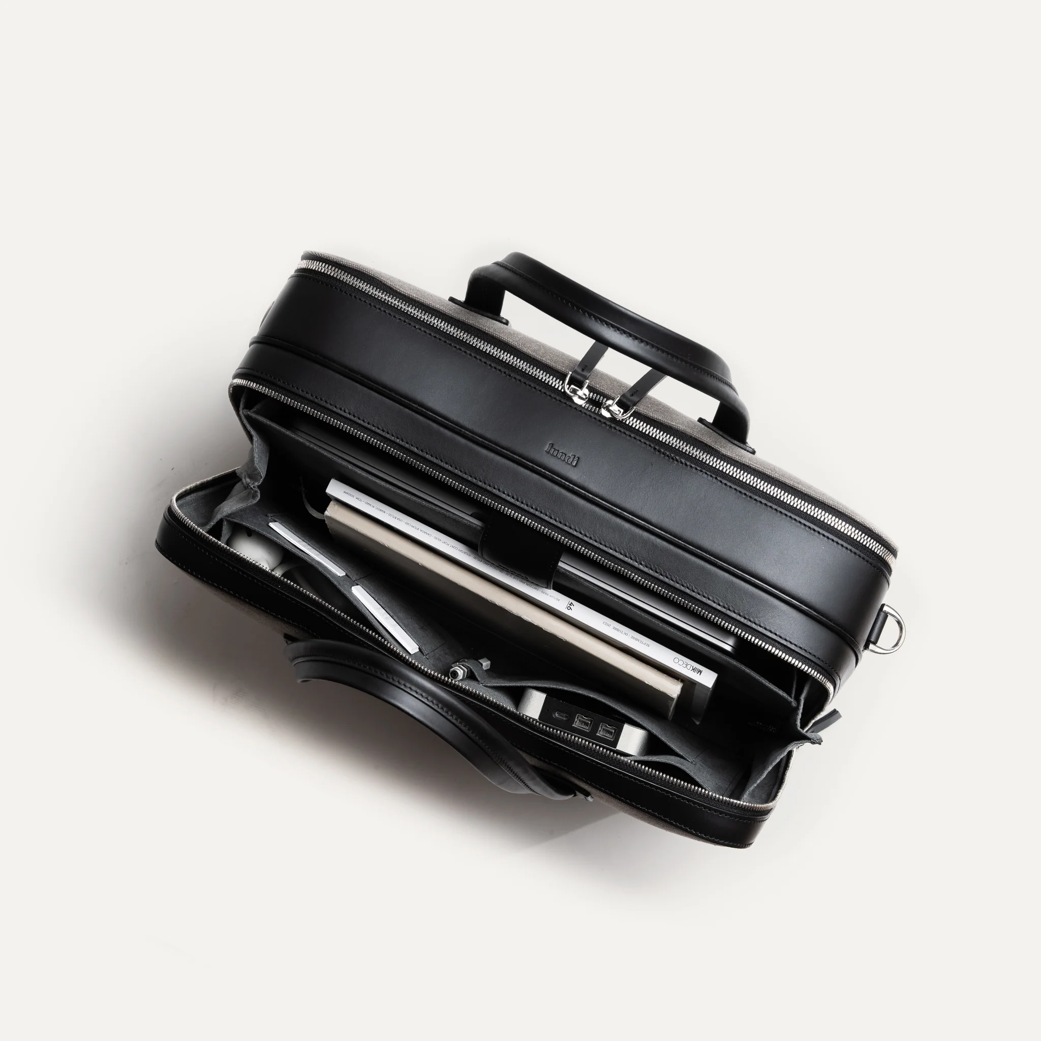 Ce sac intègre une double compartimentation pour vous permettre de séparer vos affaires professionnelles de vos effets personnels. Le premier compartiment accueille vos outils de travail : ordinateur portable (jusqu’à 16 pouces), tablette, carnets, câbles, documents A4. Le second compartiment vous permettra de ranger vos vêtements, sous-vêtements et trousse de toilette pour la nuit.