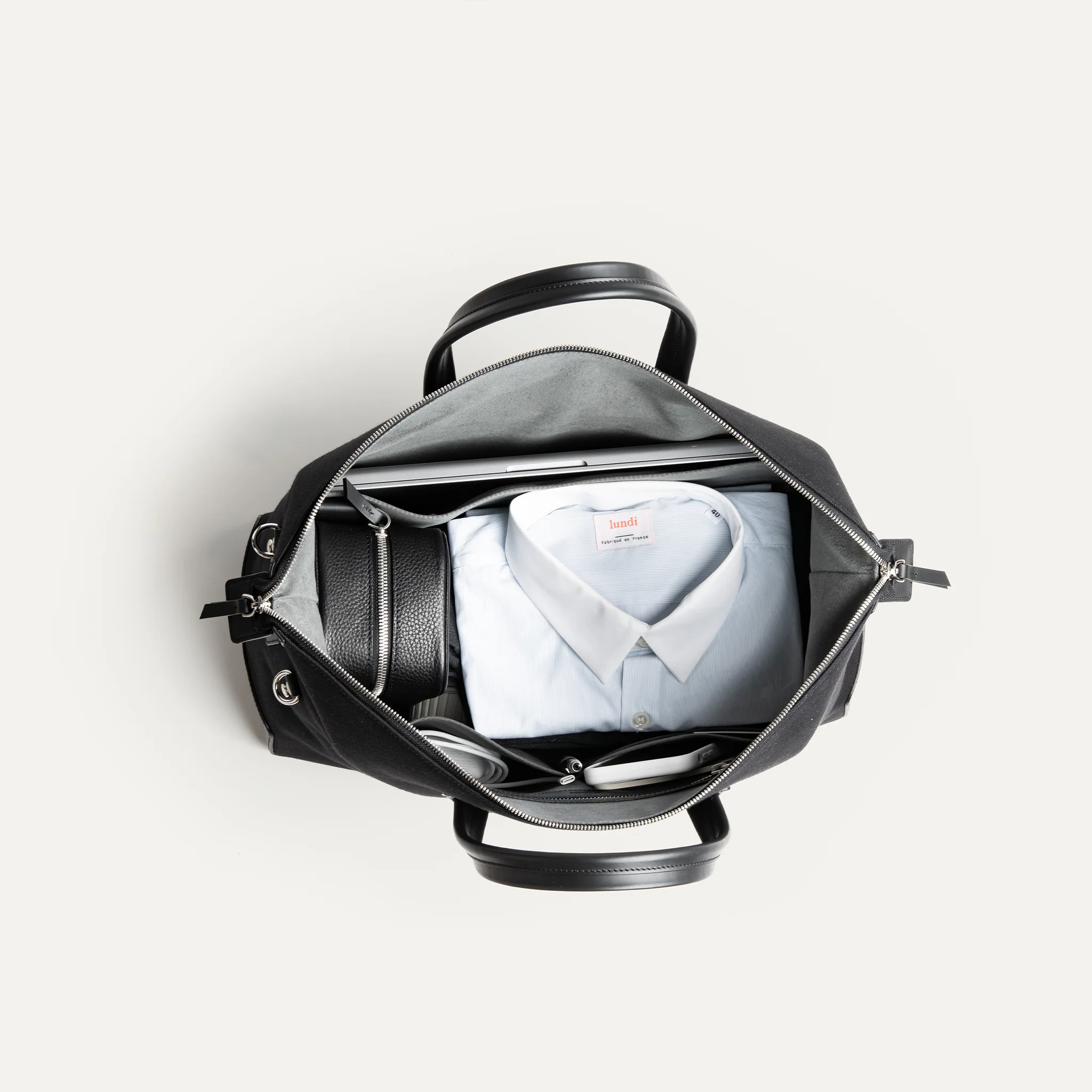 L’intérieur du sac est doublé en Alcantara, une matière douce et résistante. Vous y trouverez des compartiments dédiés pour votre ordinateur portable, tablette, ainsi que pour vos accessoires de bureau : chargeur, câbles, cartes de visite ou documents.
