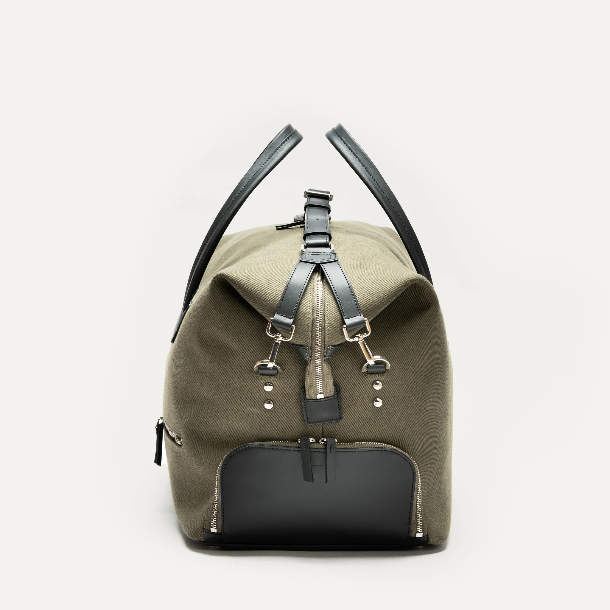 Le Remington kaki et noir est pour la femme qui aime les contrastes affirmés et les choix qui durent. Sa toile de coton sergé kaki fabriquée en France, associée à un cuir noir pleine fleur, lui confère un caractère contemporain et une robustesse discrète — une pièce pensée pour voyager vrai, sans sacrifier le style.